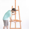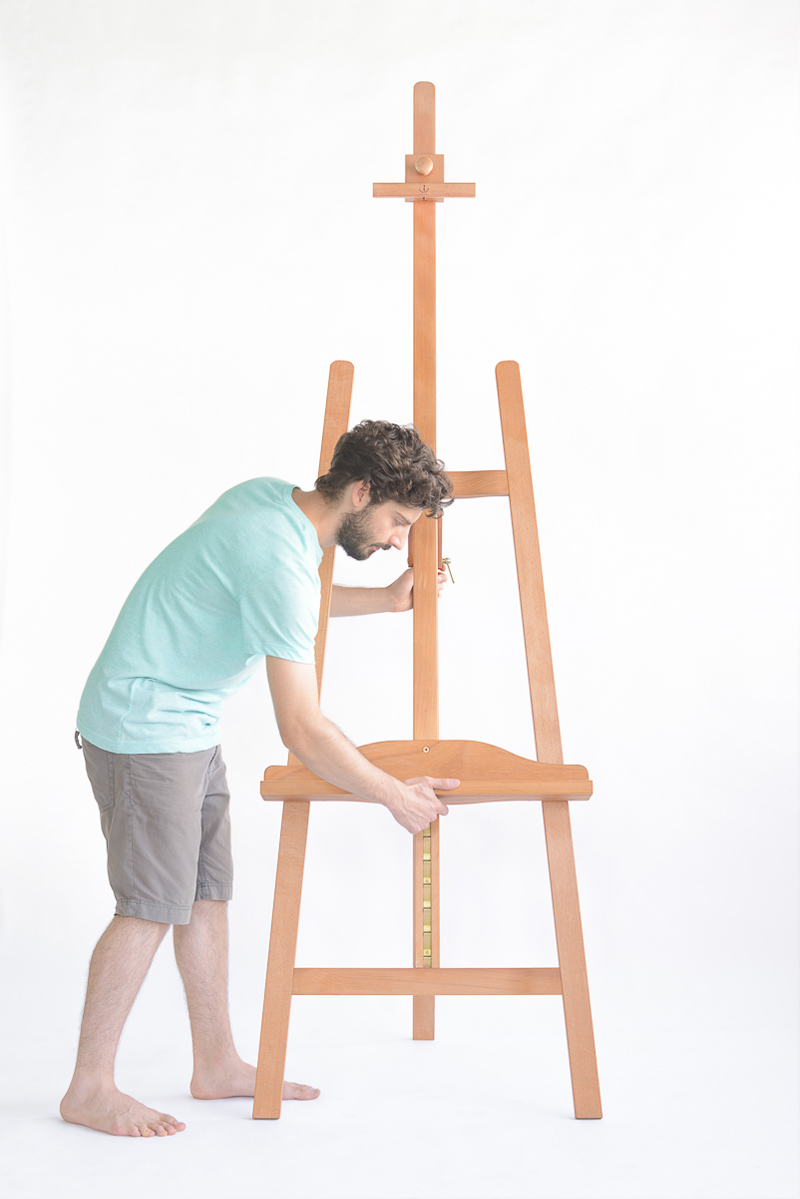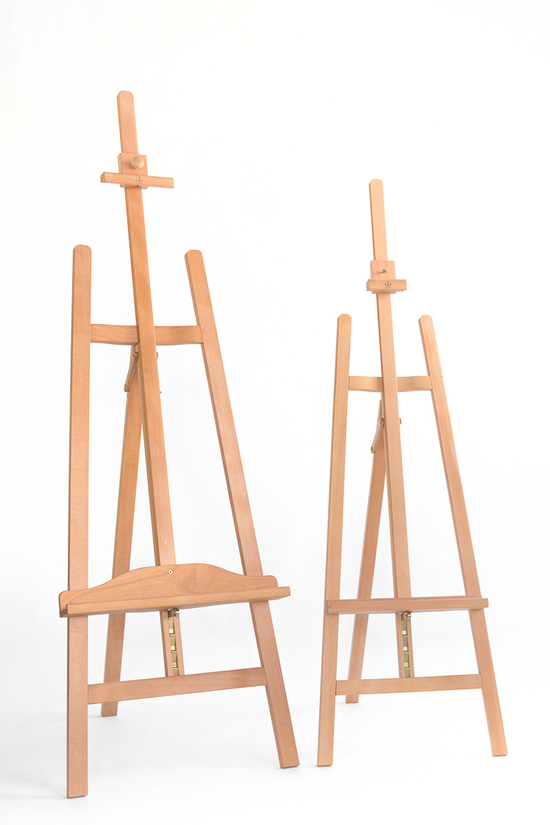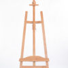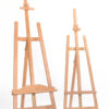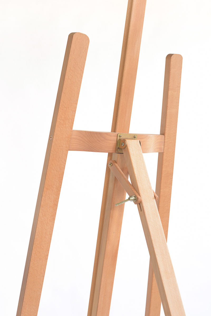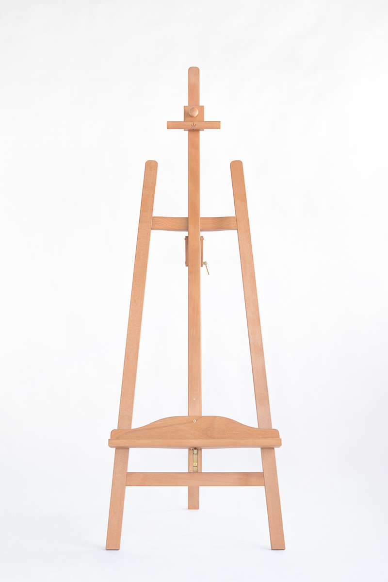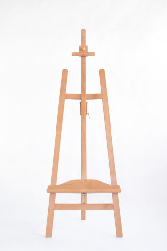 CL-29 is the giant lyre easel. It is a new big version of lyre easel in oiled beech wood with a flat support ledge. It features an improved shape and the deepened support ledge. The adjustable height deep support ledge will take a thick framed canvas. The base dimension are 68×68 cm (27″x27″) and the height are adjustable from 188 to 260 cm (74″-102″). The height of the double canvas tray is controlled by a metallic rack system with fixing ratchet. It can hold canvases up to 145 cm (57″) high and 6,7 (3″) cm thickness. The top clamp is fully adjustable. Rear support leg folds flat for easy storage. Made in seasoned beech for strength and durability.